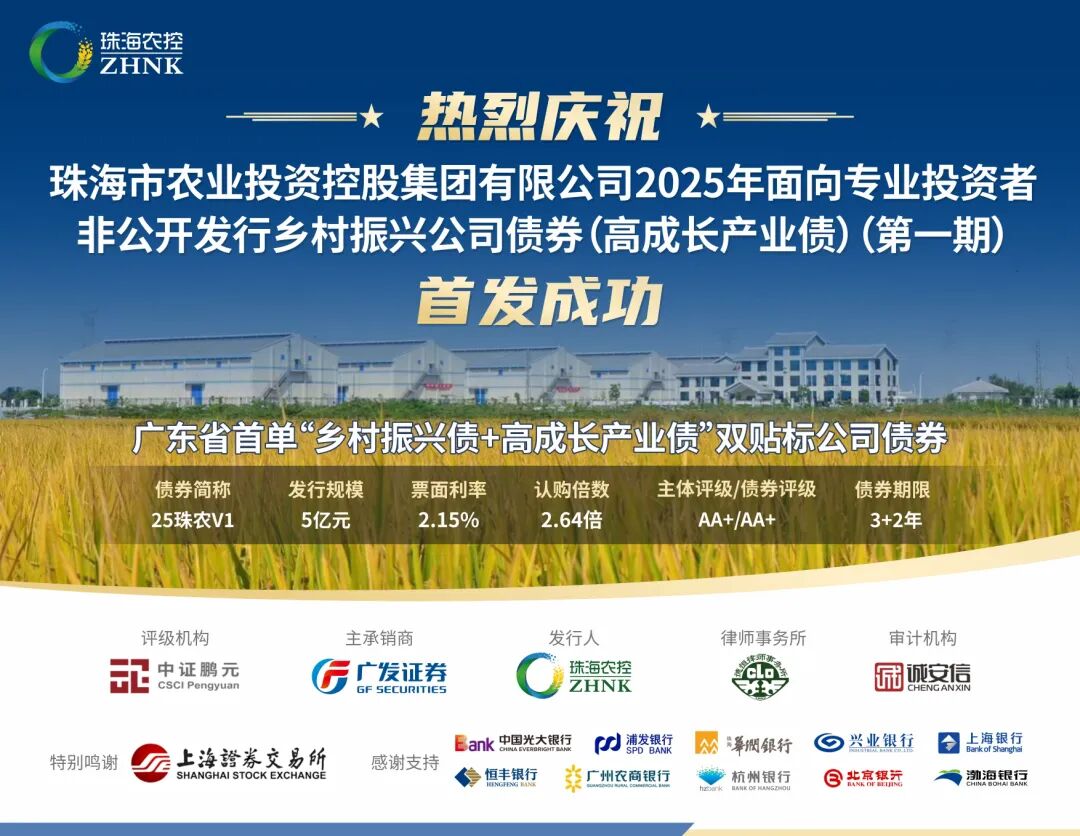 9月25日,好博(中国)体育官方网站(以下简称“珠海农控集团”)2025年面向专业投资者非公开发行乡村振兴公司债券(高成长产业债)(第一期)在上海证券交易所成功发行,本期债券发行规模5亿元,期限为3+2年,票面利率2.15%,创全国同评级、同期限乡村振兴私募公司债历史新低。